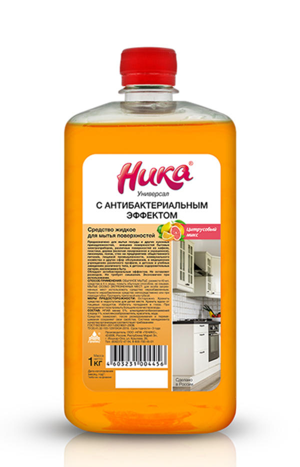 - Средство жидкое для мытья поверхностей Ника универсальное с антибактериальным эффектом цитрусовый микс, фл. ПЭТ 1 кг
