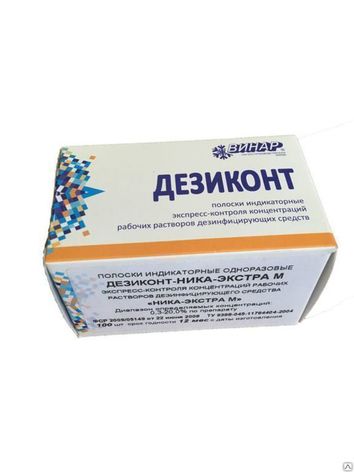 полоски индикаторные «Дезиконт-НМ» для определения концентраций рабочих растворов дезинфицирующего средства «Ника-экстра М» (далее - индикаторные полоски), выпускаемые в соответствии с ТУ 9398-045-11764404-2003, предназначены для визуального контроля правильности приготовления и хранения рабочих растворов с концентрацией 0,3; 0,5; 2,0; 4,0; 5,0; 10,0; 15,0 и 20,0 %) по препарату.