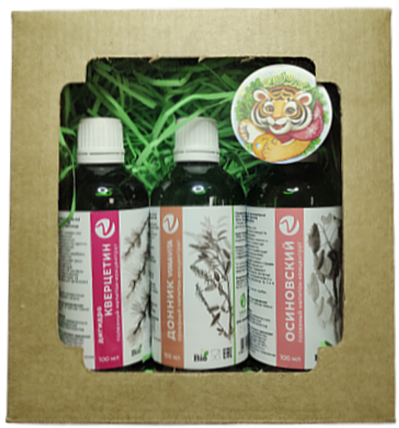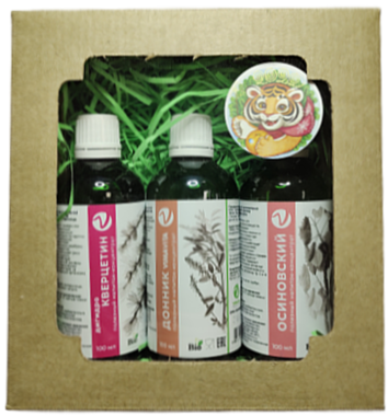 Концентрат для безалкогольного напитка «Гуминовый комплекс» 50мл -1шт. Концентрат для безалкогольного напитка «Осиновский» 100мл – 1шт. Средство гигиены полости рта натуральный био-спрей «Живица+» 100мл -1шт.